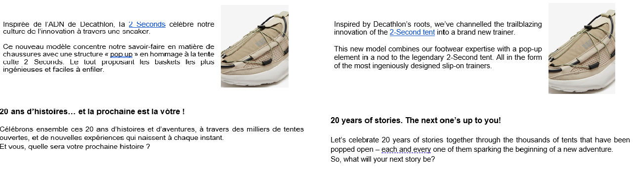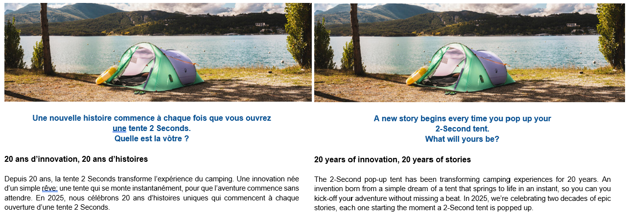 Quechua launched their 2-second pop-up tent in 2005 and were celebrating 20 years of success. I translated their marketing materials to share their story and remind customers of the convenience of the tent and how far it’s come over the years.