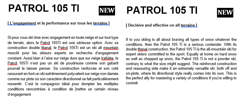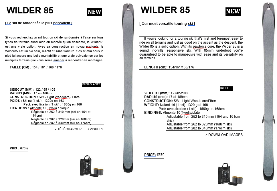 DECATHLON’s ski brand Wed’ze launched their 40-page Autumn-Winter 24/25 lookbook with their newest collection of skis, including downhill, freeride, freestyle, all-mountain and touring skis. These were aimed at not only different types of skiing, but different levels of skiers. This project involved translating their descriptions and technical specifications for an English-speaking market.